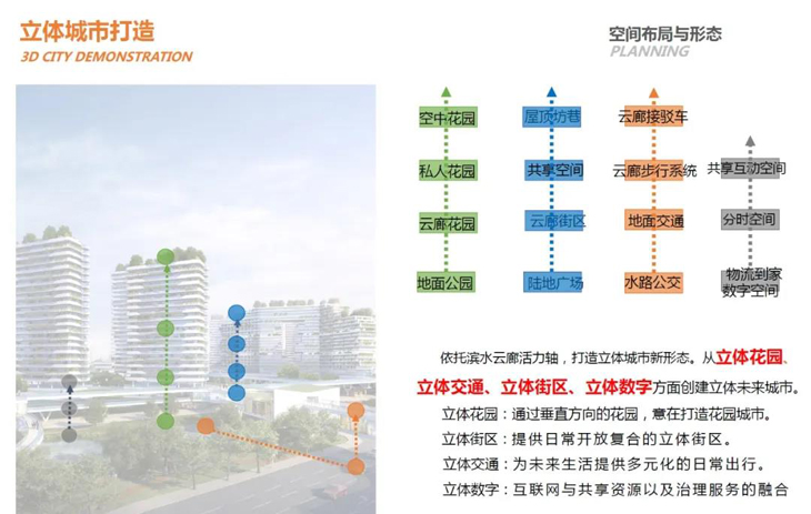 依托滨水云廊活力轴,打造立体城市新形态。从立体花园、立体交通、立体街区、立体数字方面创建立体未来城市。