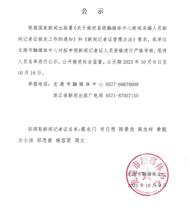 龙港市融媒体中心拟申领记者证公示(10月9日)
