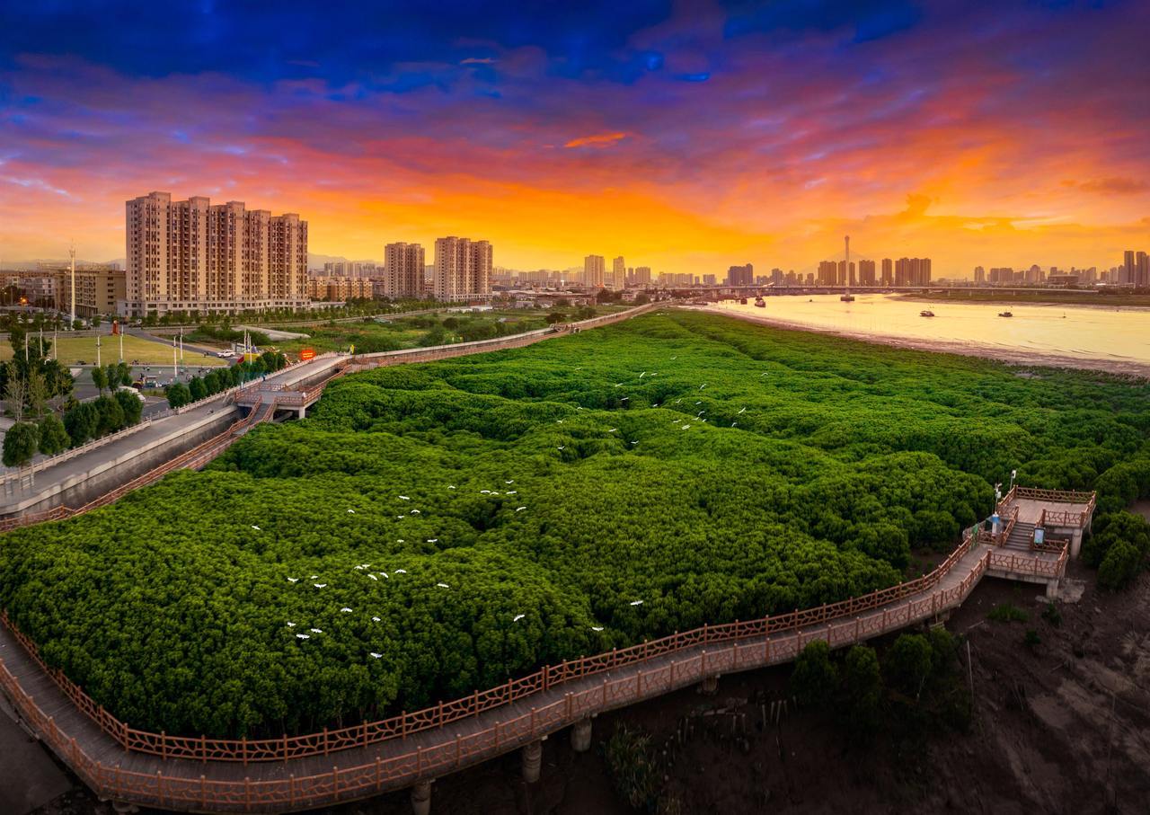沿栈道西行数百米下滩涂,茂密的红树林错落有致。轻风拂过,叶片随风摇曳,似凌空展开的绿波带。