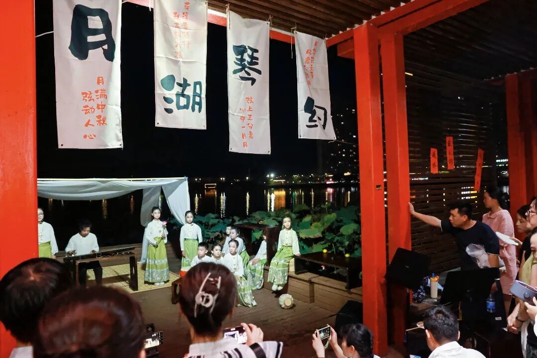 这个假期,龙港的文化活动同样精彩纷呈。在月湖公园浙派古琴雅集活动现场,孩子们身着古代服饰步入香荷长廊,在老师指导下弹奏古琴。演奏区,悠扬的琴声让观众沉醉其中。“带孩子来体验传统文化,比在家玩手机有意义多了。”参加活动的李女士说。
